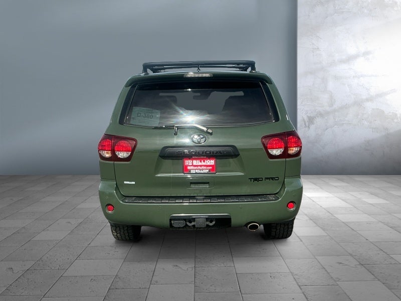 50 STATE EMISSIONS, ARMY GREEN, BLACK, LEATHER SEAT TRIM, CARGO COVER, Fixed Running Boards, Heated Front Seats, JBL Stereo System, Leather Seats, Luggage Rack, Navigation System, Power Passenger Seat, Rear Bucket Seats, Towing/Camper Pkg, TRD PERFORMANCE EXHAUST, TRD PRO PACKAGE, Univ Garage Door Opener, Roof rack,Front license plate bracket,Running boards,Perimeter alarm,Outside temp gauge,Fade-to-off interior lighting,Engine oil cooler,Leather steering wheel,Full cloth headliner,Body-colored door handles,Rear child safety locks,Compass,Deep tinted glass,Front fog lamps,Driver foot rest,Cruise control w/steering wheel controls,Day-night rearview mirror,Illuminated locking glove box,Splash guards,Air filtration,Double wishbone front suspension w/coil springs,4.30 axle ratio,Rear cupholder,Black grille w/body-color surround,Leatherette door trim insert,Steel spare wheel,Low tire pressure warning,Driver and passenger visor vanity mirrors,Manual tilt/telescoping steering column,Back-up camera,Front And Rear Anti-Roll Bars,Front Windshield -inc: Sun Visor Strip,Fully Galvanized Steel Panels,Liftgate Rear Cargo Access,Front Cupholder,Carpet Floor Trim,Cargo Space Lights,2 Seatback Storage Pockets,Side Impact Beams,Airbag Occupancy Sensor,Electronic Transfer Case,Lip Spoiler,Front And Rear Map Lights,Manual Adjustable Front Head Restraints And Manual Adjustable Rear Head Restraints,Regular Amplifier,2 LCD Monitors In The Front,Valet Function,Real-Time Traffic Display,Digital Signal Processor,Sliding Front Center Armrest And Rear Center Armrest,Cargo Area Concealed Storage,Express Open/Close Sliding And Tilting Glass 1st Row Sunroof w/Sunshade,Delayed Accessory Power,Dual Stage Driver And Passenger Seat-Mounted Side Airbags,Dual Stage Driver And Passenger Front Airbags,Body-Colored Power Heated Side Mirrors w/Manual Folding,Hydraulic Power-Assist Speed-Sensing Steering,Window Grid Diversity Antenna,Body-Colored Rear Step Bumper,Outboard Front Lap And Shoulder Safety Belts -inc: Height Adjusters and Pretensioners,Front And Rear Parking Sensors,Double Wishbone Rear Suspension w/Coil Springs,Part And Full-Time Four-Wheel Drive,Auto Locking Hubs,Full-Size Spare Tire Stored Underbody w/Crankdown,2 Skid Plates,Driver And Passenger Knee Airbag,GVWR: 7,300 lbs,710CCA Maintenance-Free Battery w/Run Down Protection,HD 180 Amp Alternator,26.4 Gal. Fuel Tank,Brake Actuated Limited Slip Differential,Body-Colored Front Bumper w/2 Tow Hooks,Black Side Windows Trim, Black Front Windshield Trim and Black Rear Window Trim,Variable Intermittent Wipers w/Heated Wiper Park,HVAC -inc: Underseat Ducts, Auxiliary Rear Heater and Headliner/Pillar Ducts,Interior Trim -inc: Metal-Look Instrument Panel Insert, Metal-Look Door Panel Insert, Metal-Look Console Insert and Metal-Look Interior Accents,Full Floor Console w/Covered Storage, Mini Overhead Console w/Storage, Conversation Mirror and 5 12V DC Power Outlets,5 12V DC Power Outlets,Off-Road Suspension,4-Wheel Disc Brakes w/4-Wheel ABS, Front And Rear Vented Discs and Brake Assist,1300# Maximum Payload,Curtain 1st, 2nd And 3rd Row Airbags,Instrument Panel Bin, Interior Concealed Storage, Driver / Passenger And Rear Door Bins,Tires: P275/65R18 -inc: Mud and Snow rated radials,Dynamic Radar Cruise Control (DRCC),Seats w/Leatherette Back Material,Fixed 60-40 Split-Bench 3rd Row Seat Front, Power Recline, Power Fold Into Floor, 3 Manual and Adjustable Head Restraints,Paint w/Badging,Wheels w/Black Accents,Driver Seat,Lane Departure Alert (LDA) Lane Departure Warning,Single Stainless Steel Exhaust w/Black Tailpipe Finisher,Passenger Seat,Pre-Collision System w/Automatic Emergency Braking (aeb),Trailer Wiring Harness,Class IV Towing Equipment -inc: Hitch and Trailer Sway Control,Engine: 5.7L V8 DOHC Dual Independent VVT-i EFI,TRD/Fox Brand Name Shock Absorbers,Wheels: 18" Black BBS Forged Aluminum Alloy,Blind Spot Monitor (BSM) Blind Spot,TRD Leather/Metal-Look Gear Shifter Material,Door Scuff Plate,Analog Appearance,Headlights-Automatic Highbeams,Collision Mitigation-Front,Driver Monitoring-Alert,Immobilizer,Auto On/Off Reflector Led Low/High Beam Daytime Running Auto High-Beam Headlamps w/Washer and Delay-Off,Rear Cross-Traffic Alert (RCTA),Power Rear Window w/Wiper and Defroster